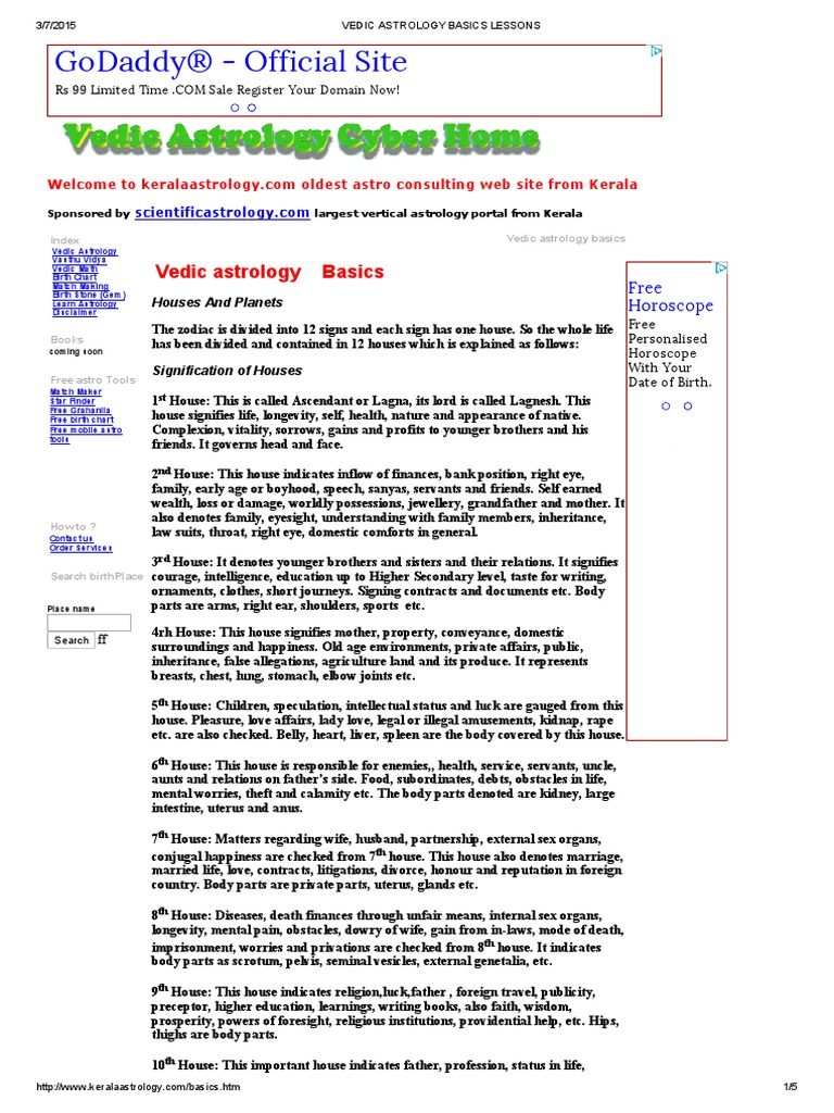 Vedic astrology free lessons - astrojyoti.com by astrologer S.P.Tata Click here to start Introduction to Indian Vedic Astrology and 10 basic lessons Na chora haaryam na cha raaja haaryam Na bhraatru bhaajyam na cha bhaarakaari Vyaye krite vardhata eva nityam Vidyaa dhanam sarva dhana pradhaanam It cannot be stolen by thieves Nor can it be taken away by kings It cannot be divided among brothers PDF Volume I - Lessons 1 to 45 1. Mantras for learning astrology. 2. Introduction to Vedic astrology (basic concepts). Key Points: 1. Lord Ganesha/Ganapathi is the deity for learning astrology. The associated mantra is "Om sri mahaganapataye namah". 2. Recite the parampara mantra "Hare Rama Krishna". [This is the moola mantra for the "Hare Rama Hare Rama, Rama Rama Vedic Astrology : An Easy Guide for Beginners | RedAstrologer Vedic Astrology Guide is for those who have keen interest to have complete details of 12 Houses, 9 Planets & How to read Horoscope. ... If you are really keen to understand Astrology, then you need to proceed step by step. Only patience and practice are the key to learning Astrology. Learn Astrology Step by Step by Joining the FREE Learn Astrology Course. Once you have completed this step, you will be able to take advanced courses with more depth to learn about how to do horoscope reading, what type of charts are used, etc. I will guide you step by step as follows: 1. Introduction to Astrology. Astrology is a fascinating subject.