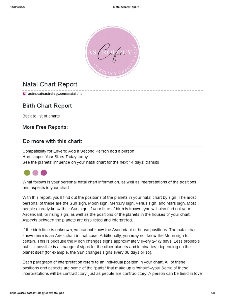 Free Astrology Reports: Natal Chart, Compatibility, Future Go beyond your Sun sign with this chart service that also includes compatibility charts with ratings, horoscopes, and transits for any date in the past, present, and future, all based on your birthdate, year, and place. If you have your birth time, all the better! Quick Link Birth Chart Report Free Astrology Reports