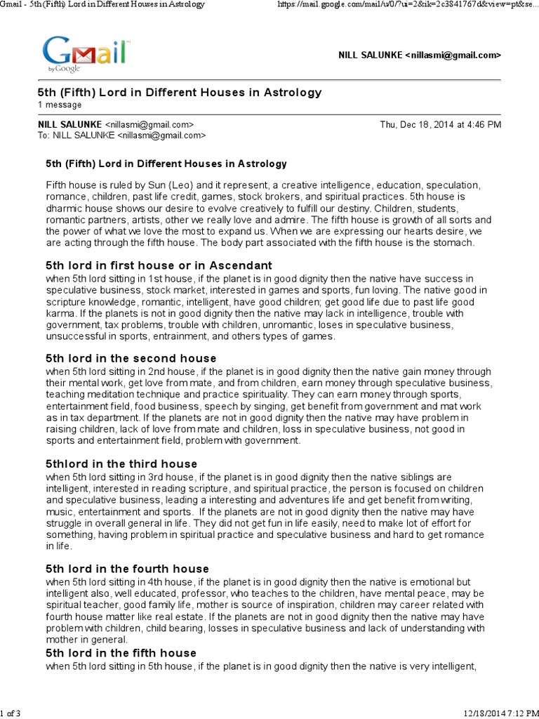 Life Partner Prediction in Astrology-Nature, Character & Type ... Lets discuss the Role of the 7th House and 7th Lord for type of Spouse in astrology. In Vedic Astrology different House from Ascendant indicates different matters of our Life. The 7th house is the Main House of Marriage and Relationship. So 7th house planets and Spouse characteristics have a close connection. 7th Lord is also Important. Effect, Lord of fifth house in various houses - AstroSage Lord of fifth house in fifth house: The native will have progeny, if related to a benefic; there will be no issues, if malefic is related to the 5th Lord, ... 5th Lord In Different Houses | Complete 1st To 12th Houses - Mahadasha 5th Lord in Different Houses will result in the 5th house as the native will be virtuous, learned and reputed. He will have good children who will do well in life. The native will rise high in life and may reach a position of trust in his organization or government. The native may have more than the average number of children. Can somebody tell me the lords of all houses in accordance ... 12 House determination in astrology · The 1st, 9th and 5th houses are named trikon and the 6th, 8th and 12th houses are called bad houses. · The rising sign is ...