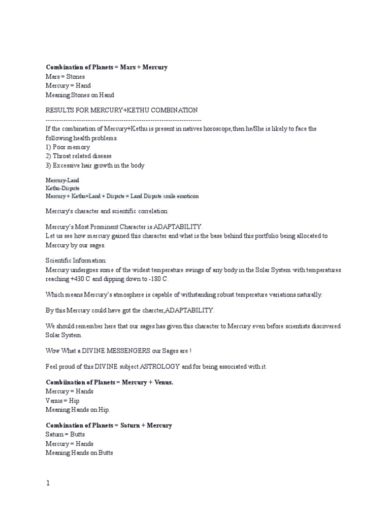 Core of Nadi Astrology PDF | PDF | Planets In Astrology - Scribd Method of judging Husband's career through combination of planets. 205. 17. 18. Nature of Wife through permutation and combination of planets with Venus Wife a Cardiac patient. 221 230. 19. ... This planet governs intelligence, intellect and in Nadi Astrology, the planets of Moon, Dragon - Tail, Jupiter & Mars are considered as inimical to Mercury.