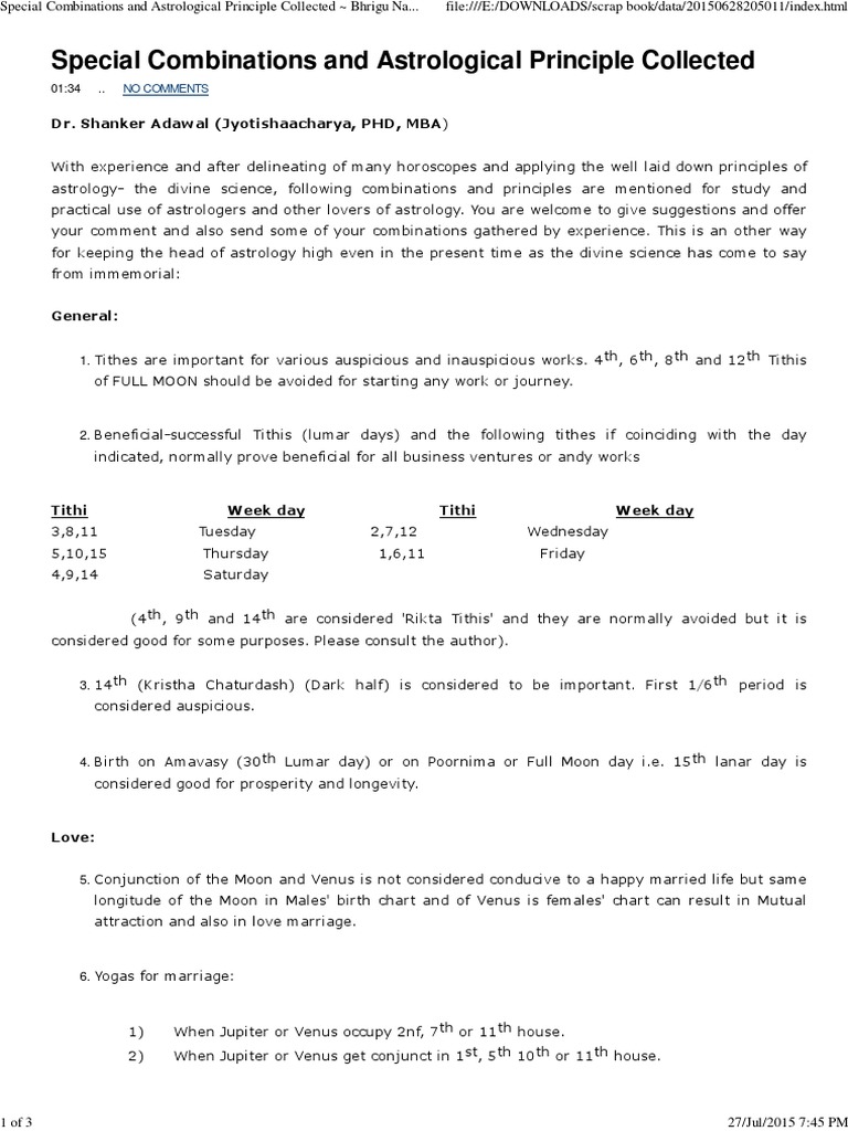 Planet Combinations & Marriage Compatibility | Planetary Compatibility ... In contrast, planetary compatibility is more of a marriage compatibility on a physical and material realm. Thus, checking marriage compatibility with reference to planets will be to check the seventh house, its lordship, and the planets occupying the house, along with the aspects in both the horoscopes. The seventh bhava, or the kalatra bhava ... Profession (combinations of planets) Part 1 - Bhrigu-Nadi Astrology ... Astrology: Mercury, Uranus. Atomic energy: Mercury, Uranus, Mars. Auctioneers: Mercury, Jupiter. Automobile: Venus Mars. Aviation: Venus, Mercury, Mars. Ayurvedic medicine: Jupiter, Mars, Venus, Sun. Dr. Shanker Adawal Profile and Dr. Adawal's Astro Channel Extraordinary Astrological Planetary Combinations/ Yogas In Astrology Important planetary combination for success and failure in competition and competitive examination:- If 6th house lord is combust or debilitated with Rahu or Ketu or Saturn then it gives failures and unsuccessful results in competition and competitive examination. Saturn Rahu together with 6th lord in 6th house will give the same result.