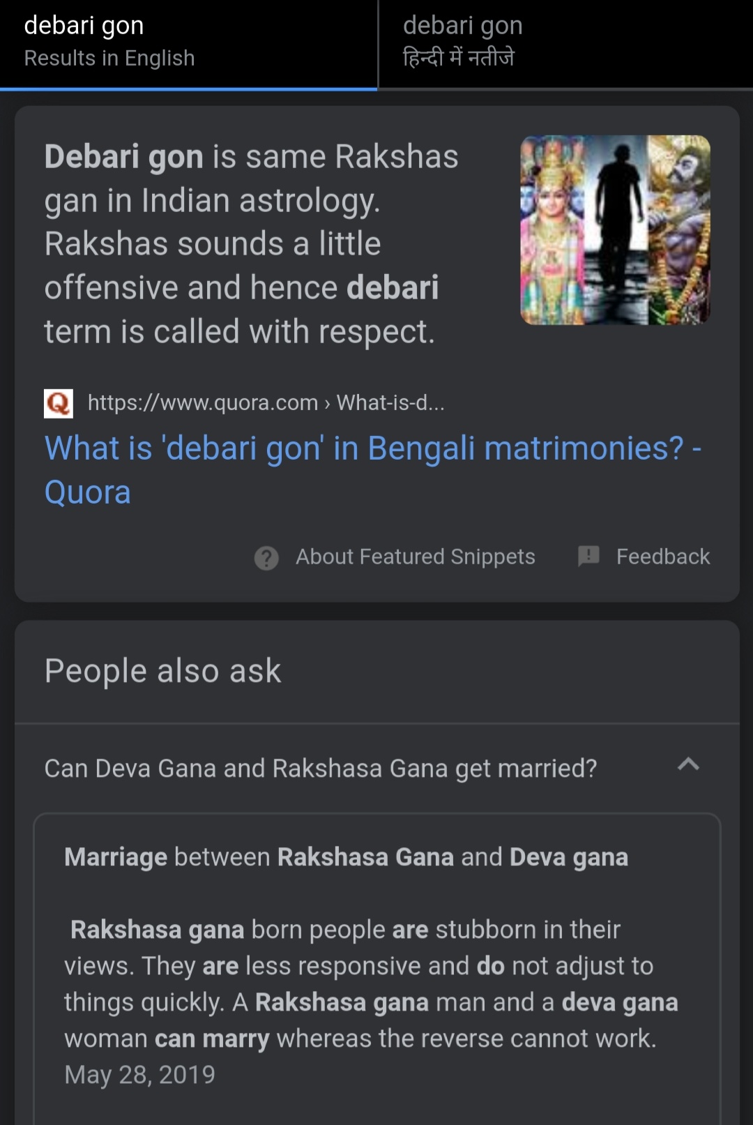Gana Koota an Important Factor in Hindu Marriage Match Making According to Vedic astrology there are 3 types of Ganas. These are Devata, Manushya and Rakshasa Gana. These 3 types of Gana represent the human gunas namely Satva, Rajo Guna and Tamo Guna. Astrology says that the gunas give people different characteristics. In this article we will discuss how an astrologer determines Gana of a person. What is 'debari gon' in Bengali matrimonies? - Quora There are three gons- Dev (Godly), Nar (manushya or human) and rakhsash (demonic) which determine the nature of a person. Debari means an enemy of Gods Debari gon is same Rakshas gan in Indian astrology. Rakshas sounds a little offensive and hence debari term is called with respect. Hope this helps. Continue Reading More answers below