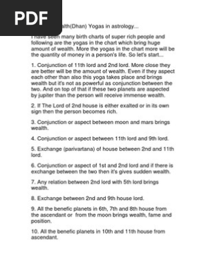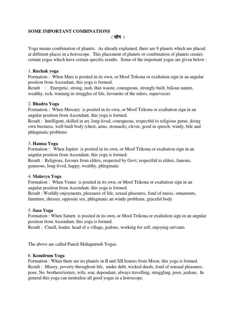 Yogas in Horoscope for Accumulating Extreme Wealth Yogas are the peculiar features of Indian. Vedic astrology, which are nothing but the planetary combinations and their positions that cause results. Let's have ... Yogas in Vedic Astrology - Free Download PDF - KUPDF Feb 11, 2017 ... Important yogas are given below: Pancha Mahapurusha Yoga : There are 5 mahapurusha yoga. Ruchaka yoga: In a kendra ars is in its own sign or ... Yogas and Doshas in Birth Chart in Indian Vedic Astrology Doshas are also astrological yogas, but when a yoga gives bad result it is called as Dosha. There are a lot of Vedic astrology yoga's that brings happiness like Raj yoga, Gajkesari yoga, Kamal yoga, Panchmahapurush Yoga, Dhan yoga. If these yogas are forming in the chart, Vedic Astrology predictions will indicate towards happy and prosperous life. Yogas In Kundli and Their Significance - clickastro.com According to Vedic astrology, yogas in Kundli imply the planetary combinations formed when a planet, zodiac sign, or house is related to one another by their placement, aspect, or conjunction. The yogas in Kundli help determine the destiny and the life path of an individual by analyzing the yogas in the birth chart.